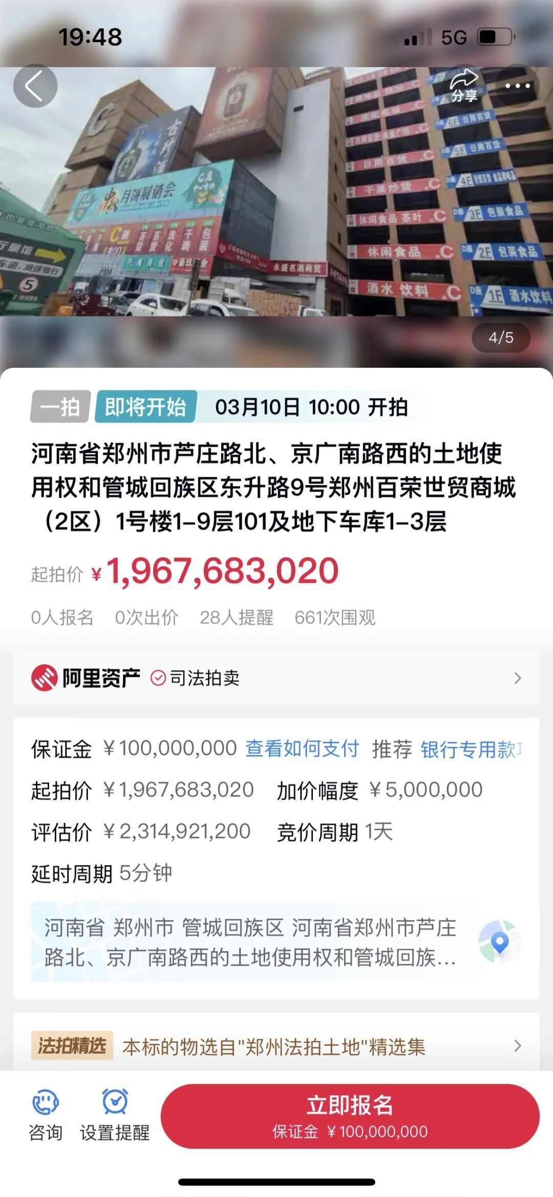 2月10日,大河财立方记者在阿里司法拍卖平台看到,郑州百荣世贸商城部分资产将于3月10日进行公开拍卖,起拍价19.68亿元。资产处置单位为郑州市中级人民法院,截至发稿前,已有28人设置提醒,共计661次围观,暂无人报名。